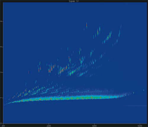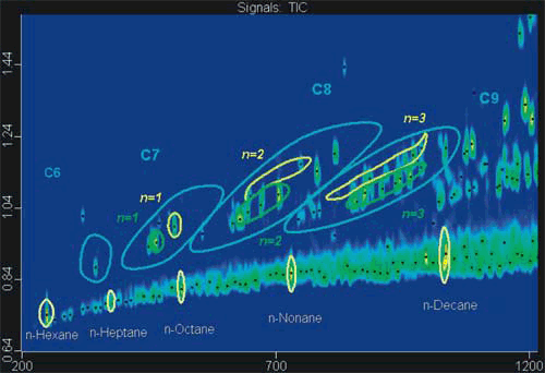 Потребности, возникающие при работе со сложными смесями, - например, при детальном анализе нефтепродуктов, - значительно превышают возможности традиционных «одномерных» хроматографов. При использовании же систем GCxGC FID хроматограмма разворачивается в двух измерениях, как показано на рисунке 1 для образца «сырого» дизтоплива.