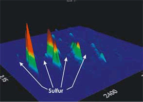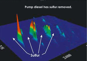При анализе GCxGC пики достаточно разделены для того, чтобы следовые компоненты, типа серусодержащей органики, можно было легко детектировать и измерять количественно. На рисунке 2 представлена объемная диаграмма, демонстрирующая присутствие таких компонентов в «сыром» дизтопливе и отсутствие – в очищенном.