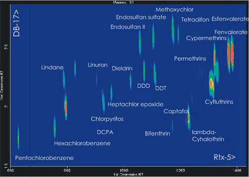 Система LECO GCxGC работает также с детектором Agilent micro ECD, что позволяет решать ей такие задачи, как идентификация и количественная оценка пестицидов в сложных матрицах. Система GCxGC ECD уверенно «фильтрует» галогенсодержащие пестициды, коэлирующие (на FID-диаграммах) с другими пестицидами (рисунок 4). При таком прекрасном разделении можно получить линейные калибровки, перекрывающие диапазоны концентраций в несколько порядков, в то время как одномерные хроматографические системы встречают здесь большие трудности, связанные с множественными коэлюциями и нелинейностью отклика.
