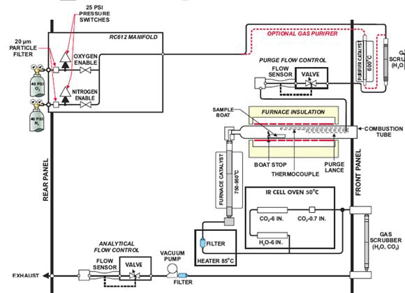 В анализаторе RC-612 используется встроенная печь, управляемая системой, которая позволяет регулировать температуру пошагово или с нарастанием с заданной скоростью. Различные источники углерода могут быть дифференцированы по температуре, при которой произошло окисление или возгонка. Чтобы применить эту дифференциацию, температурный профиль программируется на 10 различных фаз. Оператор вводит стартовую и конечную температуру, скорость нарастания и длительность выдержки при достижении конечной температуры каждой фазы.