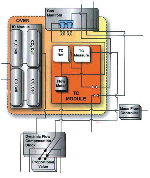 Кислород измеряется с помощью инфракрасной абсорбции. Газы выделившиеся из пробы сначала попадают в модуль с инфракрасными ячейками и проходят через детекторы СО и СО2. Измеряется кислород представленный в виде СО и СО2. После этого газы проходят через редкоземельную окись меди, которая конвертирует монооксид углерода (СО) в углекислый газ (СО2) , а водород в воду. После этого газы снова попадают в модуль с инфракрасными ячейками и проходит через СО2 ячейку для измерения общего кислорода. Данная конфигурация максимизирует производительность и точность для высоких и низких концентраций кислорода. Анализатор автоматически выбирает оптимальный диапазон измерения.