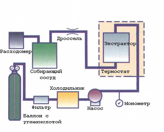 Жидкий углекислый газ из баллона поступает в охлаждаемую верхнюю часть насоса, где сжимается до требуемого давления. Нагнетая жидкость с максимальной скоростью, насос удерживает заданное давление. СО2 под давлением проходит через термостат, нагревается до температуры экстракции и проходит через экстракционные гильзы, помешенные в тот же термостат. Экстрагируемое из пробы вещество переносится в накопительную систему, где происходит сброс давления в дросселе с автоматическим контролем потока и температуры (HVR). Экстракт собирается в съемном стеклянном стакане-ловушке, заполненном минеральной ватой. Углекислый газ испаряется и удаляется в атмосферу через расходомер, который посылает сигнал обратной связи HVR во время динамической экстракции. Результаты взвешивания стаканов-сборников до и после анализа и результаты взвешивания исходных образцов поступают с присоединенных весов в анализатор и используются в расчетах процентного содержания жира. Результаты анализа выдаются на монитор и принтер.