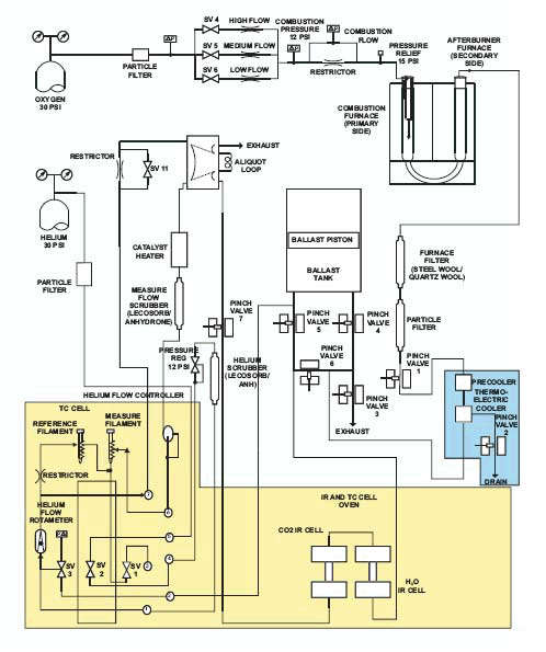 В фазе анализа газы образовавшиеся в процессе сжигания собираются в балластной емкости. Гомогенизированный газ из балласта продувается через инфракрасные ячейки H2O и CO2 и аликвоту объемом 3 см3. Углерод измеряется в виде диоксида углерода, водород в виде паров воды. Газ из аликвоты вымывается потоком гелия, он проходит через горячую металлическую медь для поглощения кислорода и перевода NOX в N2, а так же через химические реагенты поглощающие CO2 и влагу. Азот измеряется в ячейке теплопроводности.